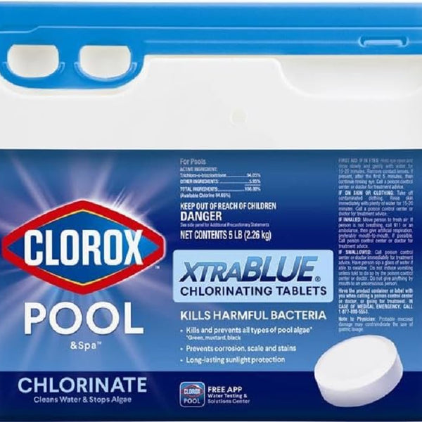 Cleans Water & Stops Algae: Kills harmful bacteria and prevents equipment corrosion, scale and stains. Kills and prevents all types of swimming pool algae (green, mustard, black)Long-lasting sunlight protection: Contains chlorine stabilizer to extend the life of your cleanCreates Silky Smooth Feeling Water: XTRABLUE chlorinating tablets contain conditioners for silky smooth feeling waterUsage: Apply 2 tablets weekly to treat 10,000 gallons of water, add more tablets as needed to maintain adequate sanitation. Safe for all swimming pool surfaces, including vinyl, plaster, fiberglass, and tile.Clorox Pool App: Test like an expert anytime, anywhere with the Clorox Pool App. Solve common swimming pool problems and get personalized product and dosage recommendations