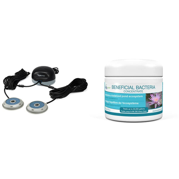 Product 1: Extremely quiet, durable, and energy-efficient pond aerator sytem for ponds and water gardens up to 2,000 gallonsProduct 1: Effectively oxygenates ponds, helping all biological processes and creating a more stable environment for your fish and plantsProduct 1: Simple to use and maintain; provides years of trouble-free operation; Power cord length - 6 feetProduct 1: Includes: (2) weather-resistant air-lines (25-feet), preassembled check valves, and (2) aeration stonesProduct 2: Combination of natural cleaners helps to provide clear, healthy water; maintain a strong biological balance in your pondProduct 2: Eight pure strains of concentrated beneficial bacteria; contains marigold and vitamin BProduct 2: 3.0 billion CFU per ounce potency, ensuring consistently effective treatmentProduct 2: Easy-to-use scoop measures 1,300 gallons of treatment per scoop