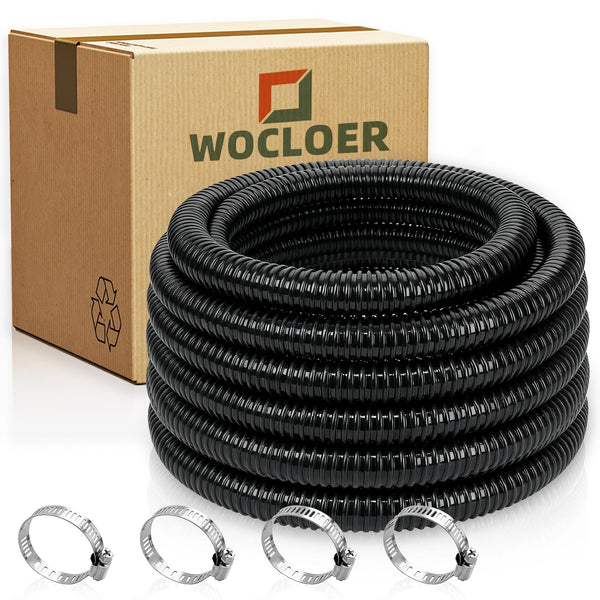 Pond Hose with 1-1/2" Inner Diameter, 1-13/16" Outer Diameter, 20 Feet Long, Includes 4 Hose ClampsMade from high-quality PVC, this pond hose is more flexible, durable, lightweight, aging-resistant, kink-free, non-collapsing, and highly abrasion-resistant compared to standard PVC hoses. It’s perfect for any project that involves water flowThe pond hose can replace any 1-1/2” hose with clamps to connect pond pumps, filters, rain barrels, and more. It’s easy to cut to your desired length, helping you complete your tasks efficientlyThe corrugated design offers excellent flexibility with a small bending radius, making it easy to bend around sharp corners and bury underground. Its smooth interior surface allows for unrestricted flow, reducing operating costsThis versatile flexible hose is ideal for ponds, aquariums, water gardens, fountains, pond pumps, filters, rain barrels, waterfalls, and all pond-related applications
