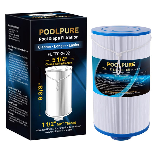 【 NSF/ANSI 50 CERTIFIED QUALITY】POOLPURE Spa filters are rigorously tested and certified by IAPMO to meet the NSF/ANSI 50 standard, ensuring dependable performance and crystal-clear water quality for your spa.【SPECIFICATIONS 】 Length: 9 3/8"; Outside Diameter: 5 1/4"; Top: Closed with String Handle; Bottom: 1 1/2" MPT Thread; Filtration Area: 42 Sq.ft; Filter Material: Trilobal Filtration Fabric.【COMPATIBLE MODELS】 PLFFC-2402 Spa Filter is compatible with Watkins 303279, Aquaterra 78460, Pleatco PFF42TC-P4, Filbur FC-2402, Lifesmart ACT-50SQFLTR, Watkins LSX1057, Pure N Clean PC-2402, SD-01322, Unicel 5CH-37. ★NOTE: POOLPURE is an independent brand offering compatible replacement products that are engineered to meet OEM standards. All original manufacturer names and part numbers are for reference only.【SUPERIOR FILTRATION PERFORMANCE】The advanced Dirt-Locking technology captures over three times more debris than standard filter cartridges, including hair, dust, fine particles, and sediment, ensuring consistently clean, fresh, and crystal-clear pool or spa water.【EFFORTLESS CLEANING】The filter's trilobal fabric structure allows impurities to be released easily during cleaning, keeping the cartridge feeling like new. For optimal performance, clean once a month. ⚠️ Do not backwash — backwashing may cause cracks or permanent damage.