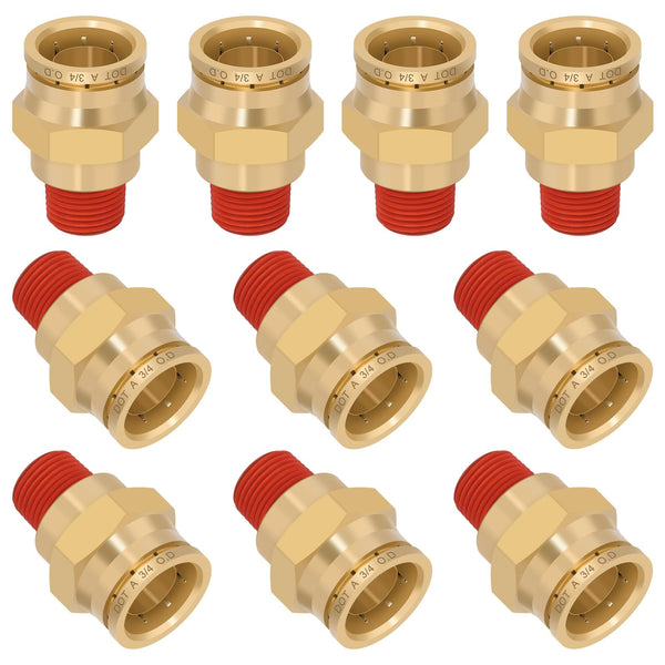 【High Quality Precision Brass】LONG SERVICE LIFE - 3/4" Tube OD x 3/8" NPT Thread straight DOT approved fittings are made of high quality solid CA360 brass with red sealent coated, durability and corrosion resistance. Withstands pressures up to 250psi, and wide temperature range from -40℉ to 160℉(-53℃ to 121℃)【Quick Push to Connect】PTC (Push-to-Connect) design for quick and easy connection and disassembly to air lines, just insert the tube directly into the air tube bottom for connection, and press the button then Pull out the tube for disassembly【DOT Approved】Meets D.O.T. FMVSS 571.106 approved, SAE J1131 air brake system requirements. For no air leakage, when installing our air suspension kit, please ensure that the cross section of the air line is smooth and flat, no gap, uneven, and the tube cannot be oval【360° Free Rotation】The connecting part can be rotated 360 degrees, allows you easier to install and use. Even after installation, just rotate the tee joint body to adjust the direction【Wide Application】Boeray DOT push to connect fittings are suitable for automotive, pneumatic and air brake systems such as air bag spring suspension line repair kits, and also can be used for brake air lines and other conventional 3/4" nylon air lines