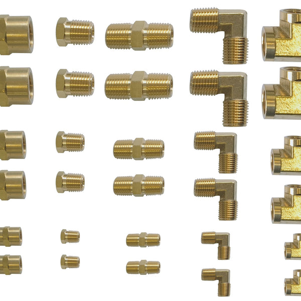 Comprehensive Kit: This brass fitting kit includes all the essential fittings, such as NPT tee, hex head, hex nipple, hex coupling and a 90 degree barstock forged elbow, model for 1/8" 1/4" 3/8", making it ideal for various plumbing and piping applications.Durable Material: The brass fittings are made of high-quality CA360 brass, ensuring the fittings are sturdy, corrosion-resistant and long-lasting.High Pressure Rating & Wide Temperature Range: With a maximum pressure rating of 1200 PSI, this pipe fitting assortment kit can handle demanding applications with ease. The pipe fittings are designed to operate in a temperature range of -65℉ to +250℉, making them suitable for use in extreme temperature environments.Easy Installation: Each fitting features NPT threads, allowing for quick and easy installation without the need for special tools or equipment.Versatile Application: This pipe fitting kit is suitable for various applications, such as grease, refrigeration, instrumentation and hydraulic systems, can be used with brass, bronze and iron pipe.