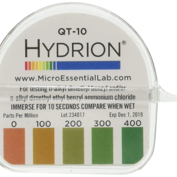 Each Case contains 10 rolls of QT-10 SANITIZER Test Tapes which test 2-Chain Sanitizer Solutions in the RANGE 0-400 ppmPLEASE READ or Ask any Questions to ensure you are selecting the correct Sanitizer test tape for the FOOD SERVICE Sanitizer Solution you are using. It's crucial to use the correct test strip for your sanitizer to ensure accurate sanitization and avoid potential health code violations. QT-10 is for testing 2-Chain Quat types typically measuring concentrations between 0-400ppm, with a specific reading at 200ppm.QT-10 test tapes are calibrated to test the concentration of Alkyl dimethylbenzyl ammonium Compounds Roccal II, Hyamine 3500Test solution should be room temperature (ideally 65-75 degree farhenheit)Test paper should be held in motionless solution for ten seconds. Results should be read immediatelyColor chart shows matches at increments of 0-100-200-300-400 ppm for testing Quaternary Sanitizers